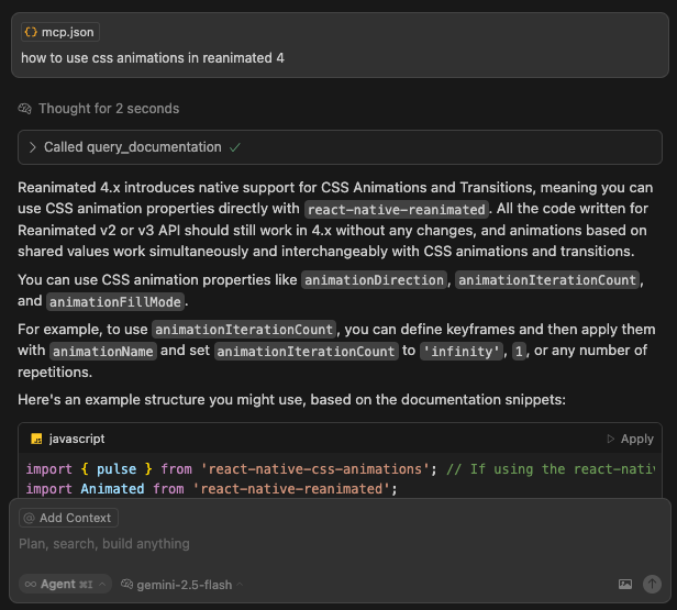 We index all of the popular React Native libraries to match questions to relevant pieces of documentation, providing additional, accurate context to your conversation.