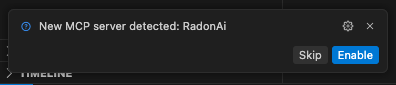 The Radon IDE automatically adds the Radon AI MCP server configuration by creating a .cursor/mcp.json or appending an entry if this file exists. Cursor detects this change and asks you to enable the server.