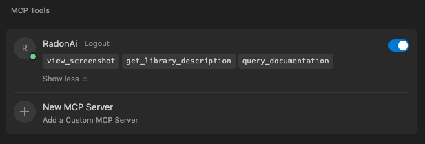 You can to configure the Radon AI MCP server from Cursor Settings. There, you can adjust the server configuration, choose which tools are enabled or disable the MCP server completely.